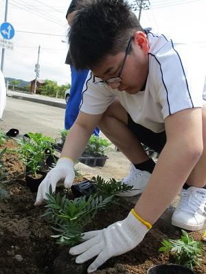 6月25日(金)に、宝立公民館の方々のお世話で、金峰寺のファミリマートの向かいの沿道に マリーゴールドを植えに行ってきました。初めに植え方の説明をしていただきました。生徒は一人当たり10鉢ほど植えたので、どんどん上手になってきました。最後の仕上げにジョウロで水をやりました。これから暑い夏がやってきますが、元気に咲いて通る人たちに元気をくれることでしょう。