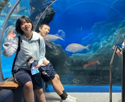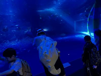 ライトで照らされてキラキラ輝く水槽に目を輝かせたり、優雅に佇むジンベイザメや、トンネルの中をスイスイ泳ぐ魚たちを観察したり、飼育員さんと息ぴったりなイルカショーを楽しんだりしました。