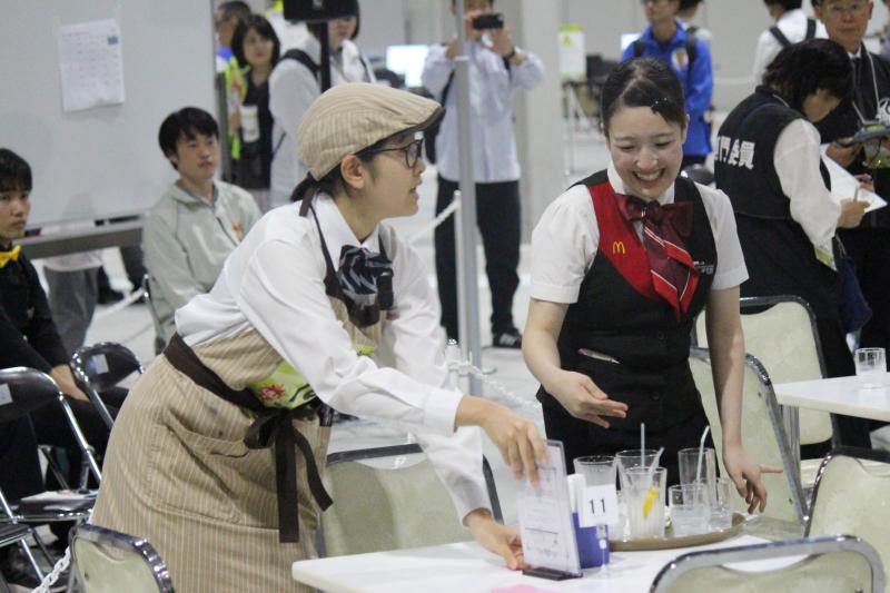 大会の競技内容はクジ引きで決まったグループのメンバー4人と協力して25分×2回、実際のお客様にサービスを提供するもので、お互いに声を掛け合い、どうすればいいかそれぞれが考えて<みんなで協力し合ってより良いサービスを提供する>競技です。自分なりにどうすればいいか考え、グループの方々に分からないことは質問したり、アドバイスをもらったりして、一生懸命接客をしてきました。