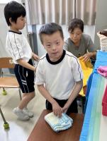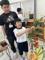 7月に入ってからの生活単元学習は、七夕会に向けて短冊に家族の人と考えた願い事を書いたり、飾りを作って飾ったりしました。みんな笑顔で自分の願い事を笹に飾っていました。