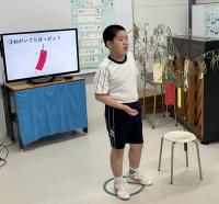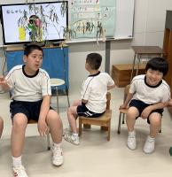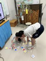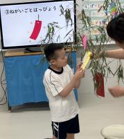 そして、7月7日の七夕の日、みんなの前で自分の願い事を発表しました。「しんかんせんにのりたいな。」「はなびをみたい。」「にんじんがたくさんとれますように。」など、一人一人の願い事を発表することができました。また、星集めゲームやベルハーモニーなどをして、楽しい時間を過ごすことができました。
