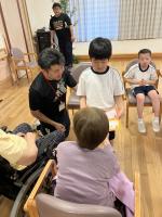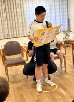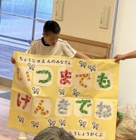 「あんたがたどこさ」では、皆さんと笑顔で手をタッチし合う姿も見られ、温かい雰囲気に包まれました。最後はみんなで作った「いつまでもげんきでね」というプレゼントを渡すと、皆さんはとても喜んでくれました。