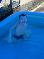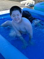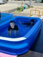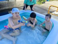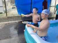 夏休み前の最後の週に、プールを2つ使って水遊びをしました。水鉄砲でプールの水をかけ合ったり、水に潜ったりして、水遊びを楽しみました。プールに浸かって元気に大はしゃぎする姿を見て、元気をもらいました。水遊びをする前に、「プールのはじっこに乗らない」「プールの周りはあるく」「水鉄砲を顔に向けない」といったルールを確認しましたが、みんなルールを守って水遊びを楽しむことできていました。