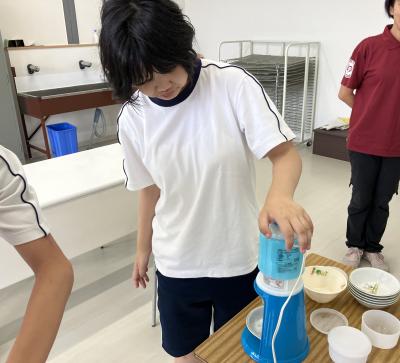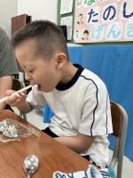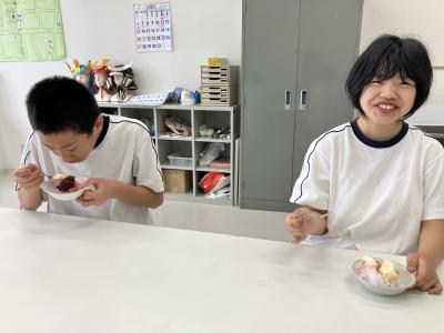 今日は、登校日でした。久しぶりに友達や先生に会えてうれしそうな姿が印象的でした。この日は、わくワーク体験(職場体験)に行ってきた生徒の発表会を行い、その後はかき氷を食べました!