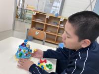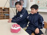 生単で誕生日会をしました。「ハッピーバースデー」を歌ったり、ダンスをしたり、ゲームをしたりして楽しい時間を過ごしました。友達や先生方からのメッセージカードをプレゼントする際は、「おめでとう。」「ありがとう。」とやり取りしている姿が素敵でした。