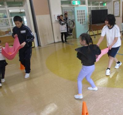 県のインクルーシブ保育事業の一環で、松波こども園のみなさんと交流してきました。互いに自己紹介をした後は、ゲームや風船を使った自由遊び、ダンス等で楽しく交流しました。途中、園児のみんなから「一緒に遊ぼう!」と声をかけてもらい一緒に遊んだり、生徒から「ありがとう」と声をかけて仲を深めたりする場面が多く見られました。