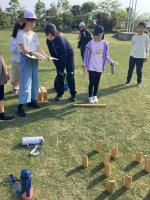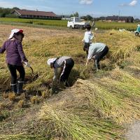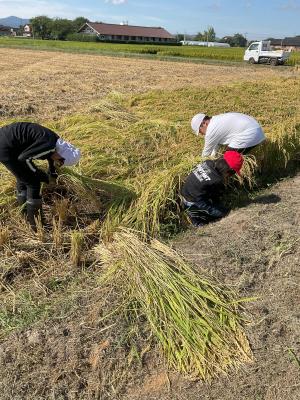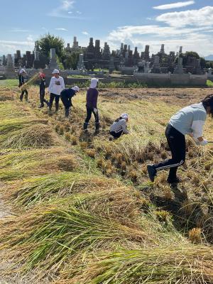 初めはなかなか稲や鎌の扱いに苦労していましたが、短い時間の間にコツをつかんで上手に刈れるようになりました。中には、2束の稲を一気に刈り取る人もいましたね。