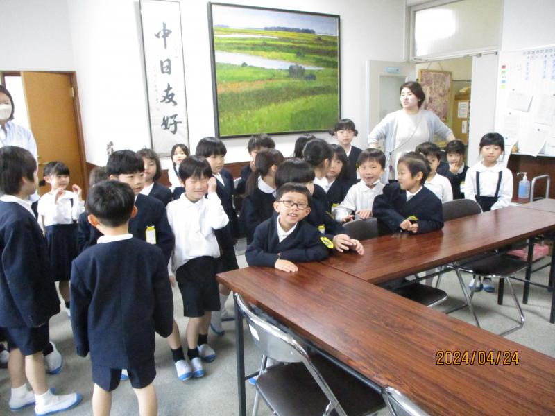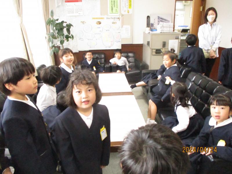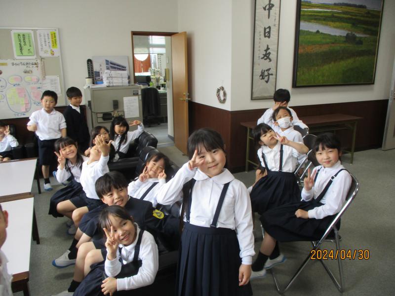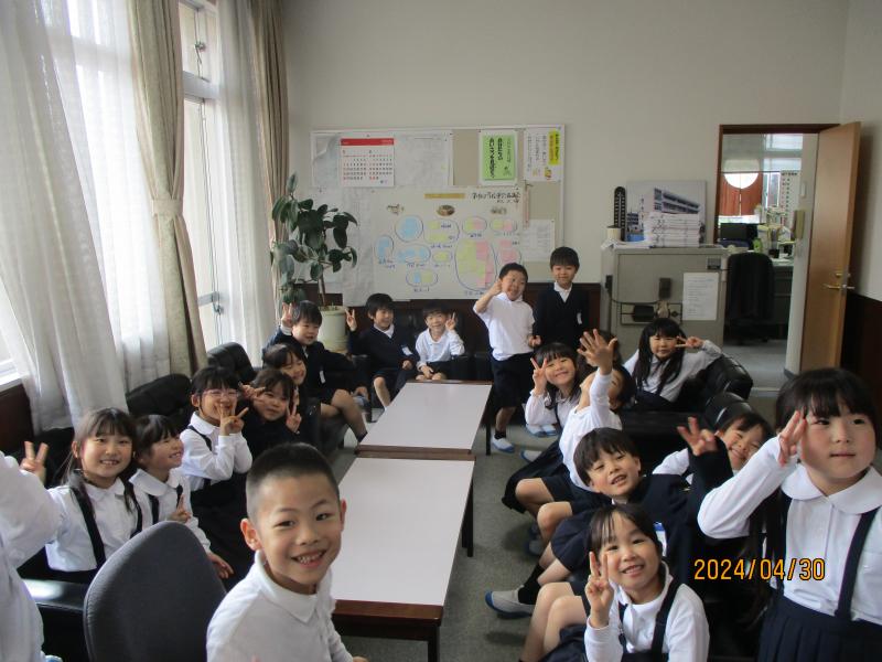 1年3組が学校探検で校長室に来てくれました。ソファーに座り大満足していました。