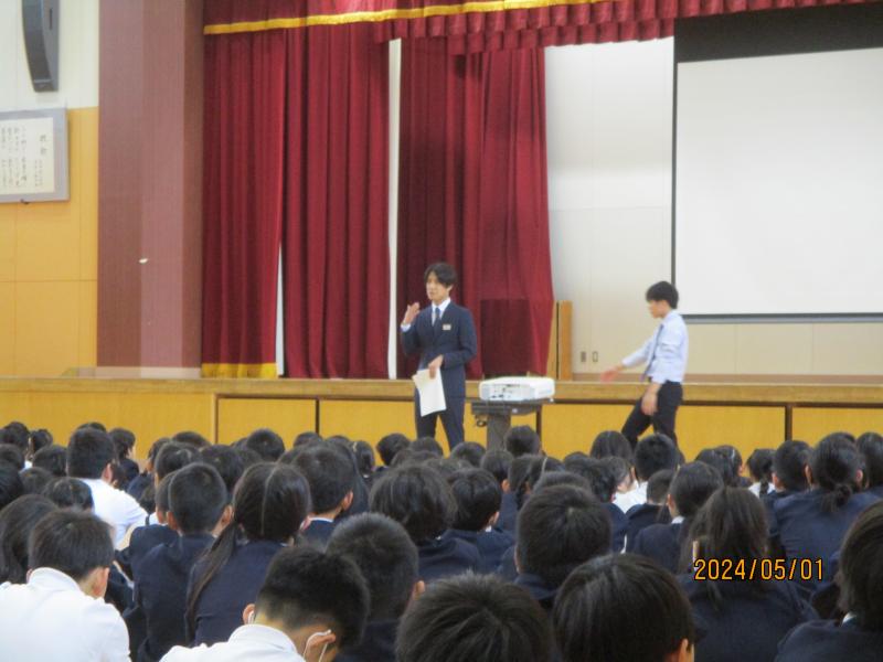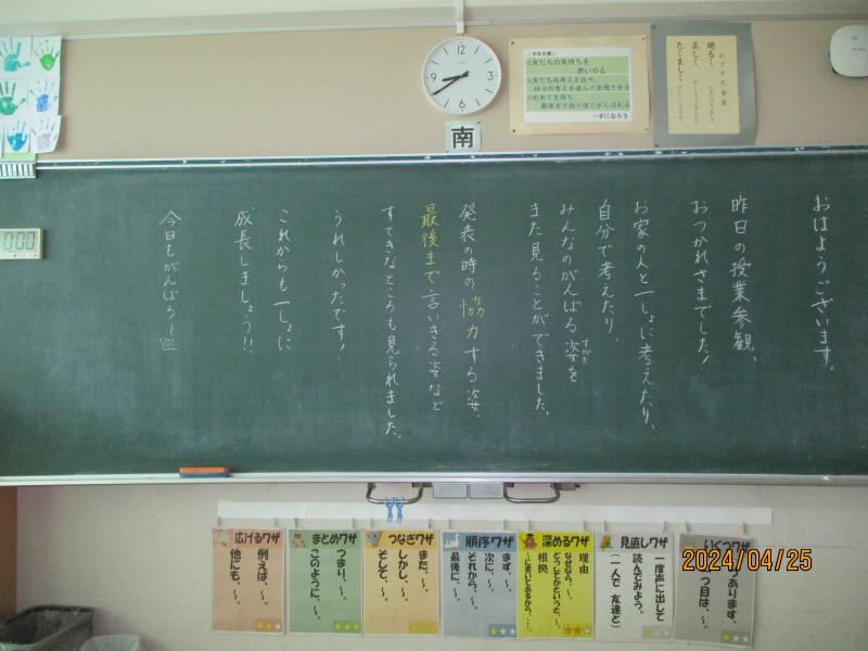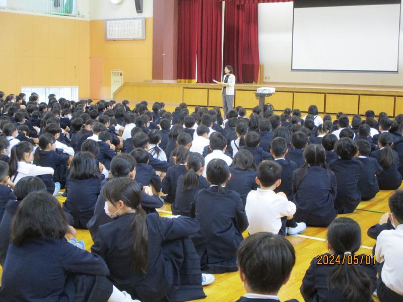 生徒指導の先生からは、よいことを伝えるポカポカカードの説明がありました。全校にあったかい言葉を広げること、学習の先生からは、5月スタートバッチリ習慣のお話がありました。「聴く」という聞き方の意味のお話がありました。目を見て、返事をしながら、分かろうしながら聴くとどんどん賢く優しく成長していきましょう。