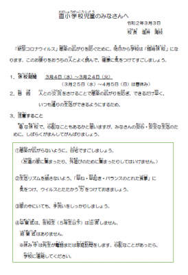 ①おたより[臨時休校のお知らせ]を長子に配付します。ご一読を。