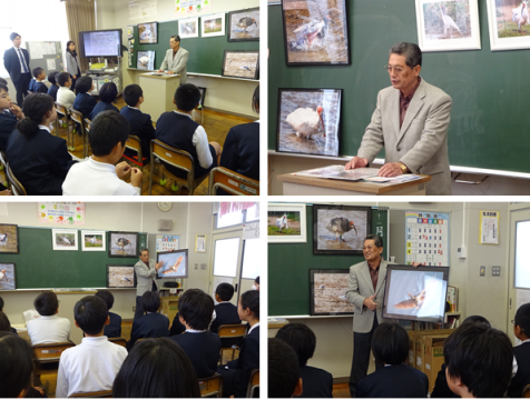 児童は、1枚1枚の写真に食い入りながら見入っていました。また質問の時間には、朱鷺が撮影された場所や飛行できる距離についての質問が出ていて、朱鷺について学ぶ充実した良い機会となりました。