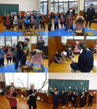18日(水)に公民館で、長生会の方と一緒にもちつき大会と花もちづくりを行いました。半分くらいの子が餅をつくのは初めてでした。子どもたちは、蒸し上がったもち米を見て「とってもいいにおいがする!」「これがおもちになっていくんだね!」と声をあげていました。長生会の方に手伝ってもらいながらきねでもちを何度もつきました。「ぺったん、ぺったん」とお互いに応援しながら、リズム良くもちをつくことができ、とても良い体験になりました。