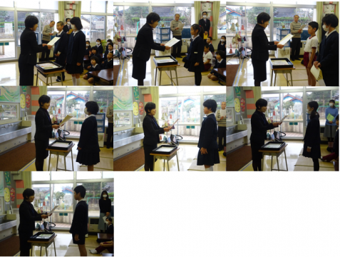 19日(木)の朝、なかよしルームで全校朝会を行いました。たくさん集まった表彰を、順に行いました。行った表彰は次のものです。