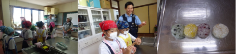 はじめに、直公民館の方やお巡りさんと一緒に4種類のおにぎりを作りました。おにぎりを作るのは初めてだという子もいましたが、上手に形を整えながら作ることができました。わかめ味、たまご味、うめ味のおにぎりはパックに詰めて信号機のようにしました。初めに作ったごま味のおにぎりは、全員でおいしく食べました。
