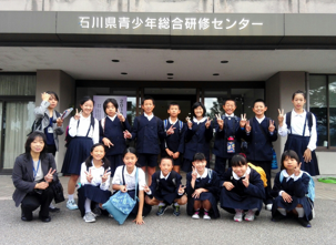 8日に3・4年生で七尾方面へバス遠足に出かけました。全員で参加することができました。朝の天気はあいにくの雨でしたが,みんなに「雨を吹(ふ)き飛ばすほどの元気で楽しもう!」と声をかけて出発しました。移動中のバスの中では,バス係が計画していた歌やなぞなぞをしました。歌は,みんなが知っている「パプリカ」や「勇気100%」を元気に歌いました。なぞなぞは,バス係が作ったなぞなぞをみんなで考えました。おかげで,長い移動時間を楽しく過ごすことができました。