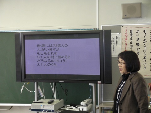 1/22(金)の朝学習は,先生方による読み聞かせでした。高学年では,学校長が「世界がもし31人の村だったら」という話をしました。100人を高学年の人数31人にし計算し直して,わかりやすく伝えてくれました。