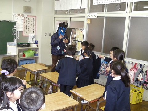 2/3(水)は節分の日。直小学校では,一年生教室に突然青鬼が登場しました。泣き虫鬼・いやだ鬼・意地悪鬼などのたくさんの鬼を追い払うことができました。