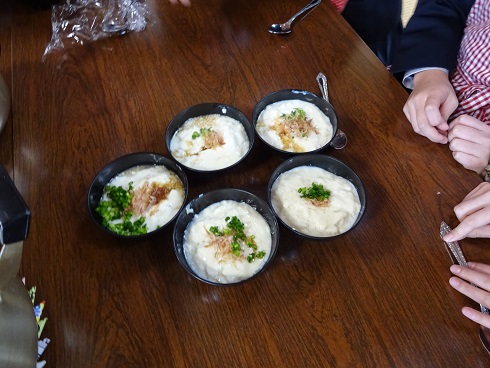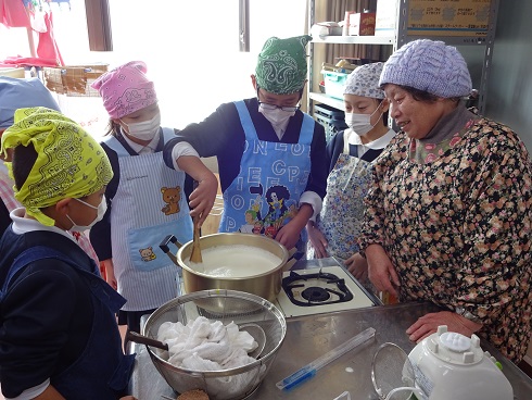 2月16日(火)に4年生15名が豆腐づくりを体験しました。公民館で地域の4名の方々にに教えていただきました。とっても甘くておいしい豆腐でした。ありがとうございます。