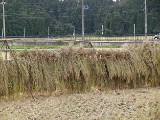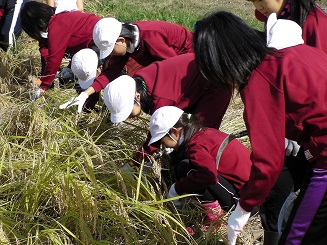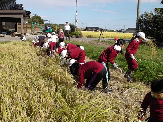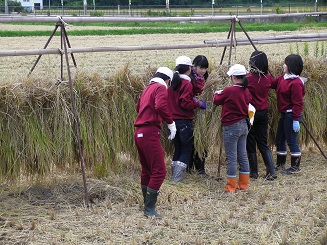 9月29日(火)の午後から5・6年生で稲刈りをしました。さわやかな秋晴れとなり,みんなではざ干しまでしました。刈ることはとても上手にできましたが,稲を束ねて縛ることがとても難しかったです。