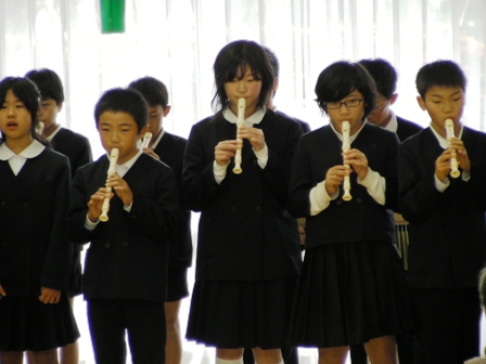 12/24(水)は,2学期の終業式です。学校長からは,「歌声」「あいさつ」「返事」の3つの約束がしっかり守られていてうれしかったという話がありました。児童からも,自分のがんばったことや心に残ったことを話してもらいました。以前に比べ,児童も進んで手を挙げて自分を表現することが多くなってきました。