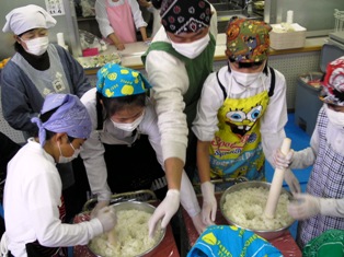25家族86名が参加して,家族で仲良くおにぎりをにぎりました。お米は,学校田で育てたコシヒカリを使いました。はざ干しした新米をガス釜で炊きあげたほくほくのご飯です。