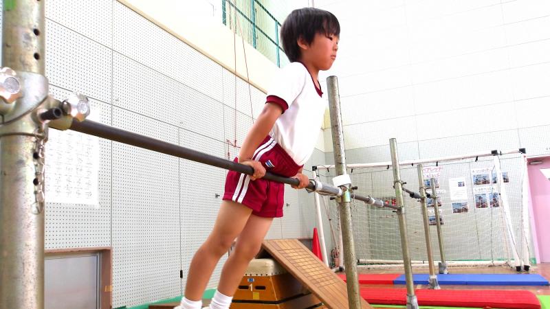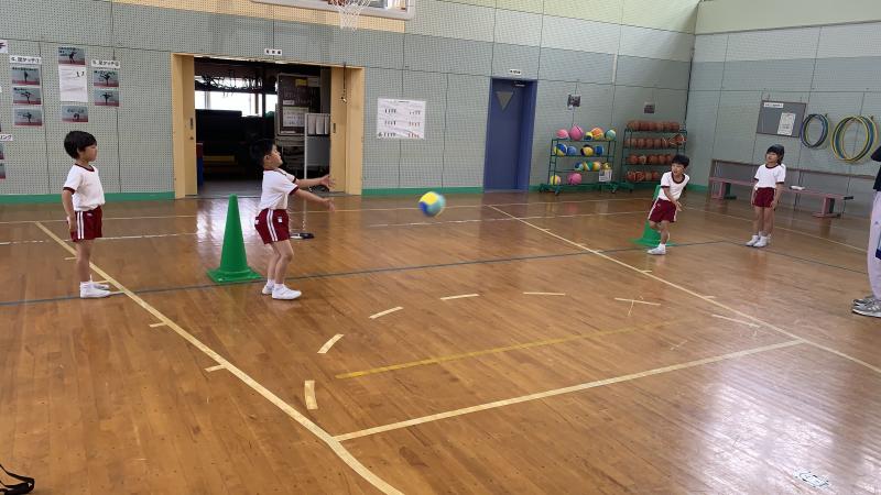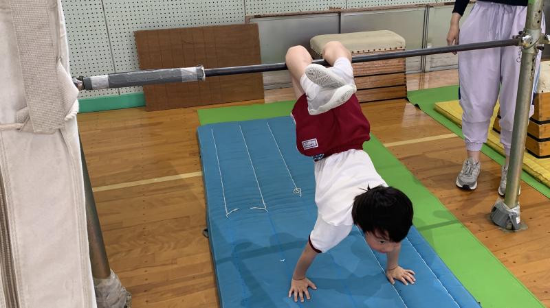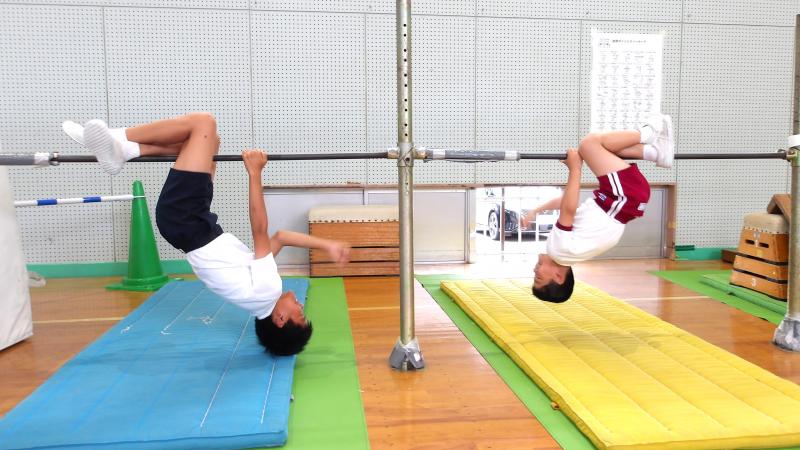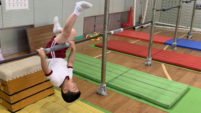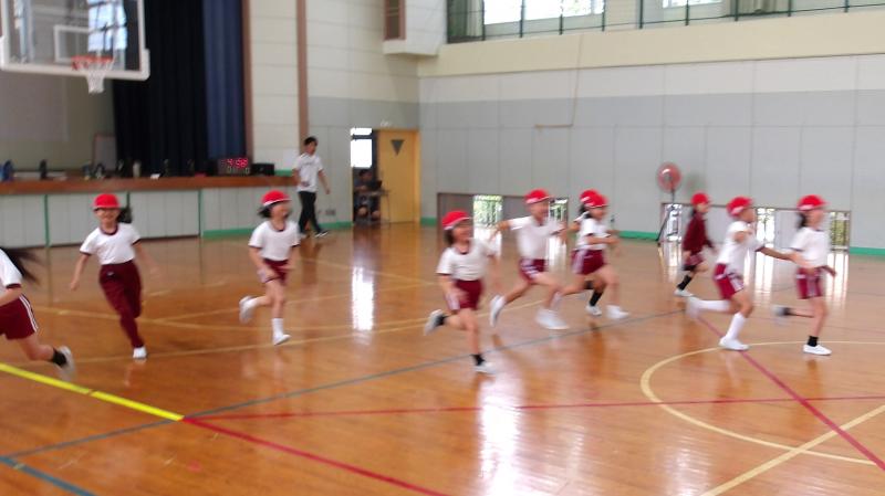 1年生の体育です。鉄棒をしていました。こうもり降りや逆上がりの練習をしていました。皆チャレンジ精神旺盛で、とても頑張っていました。鉄棒の後は、スポチャレいしかわの「シャトルボール」に取り組んでいました。こちらも元気一杯に張り切ってやっていました。