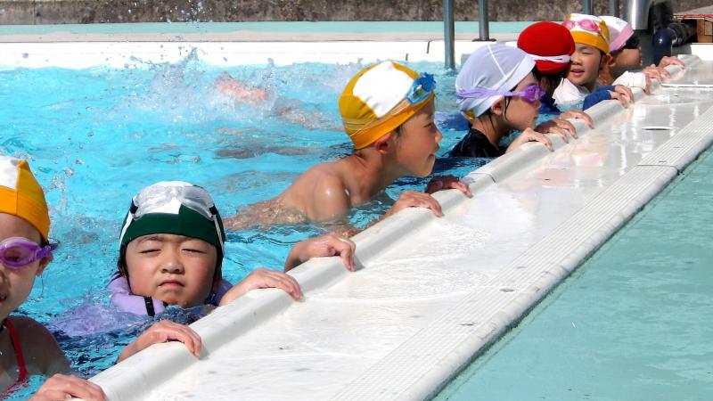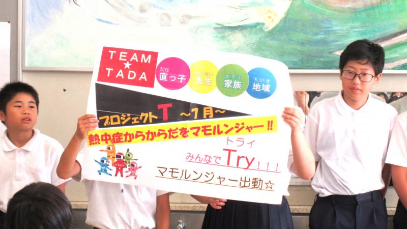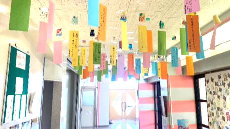 1枚目は、今年は、七夕の短冊を天井から吊るしています。風鈴調のデザインとし、見た目にも涼しげです。2枚目の写真は委員会発表です。1学期、どの委員会も本当に頑張ってくれました。3枚目は水泳学習。とても気持ちよかったようです。