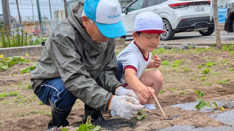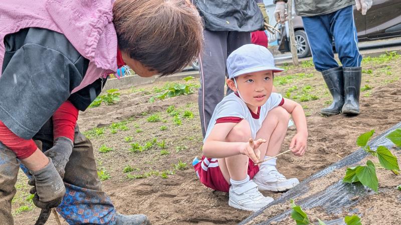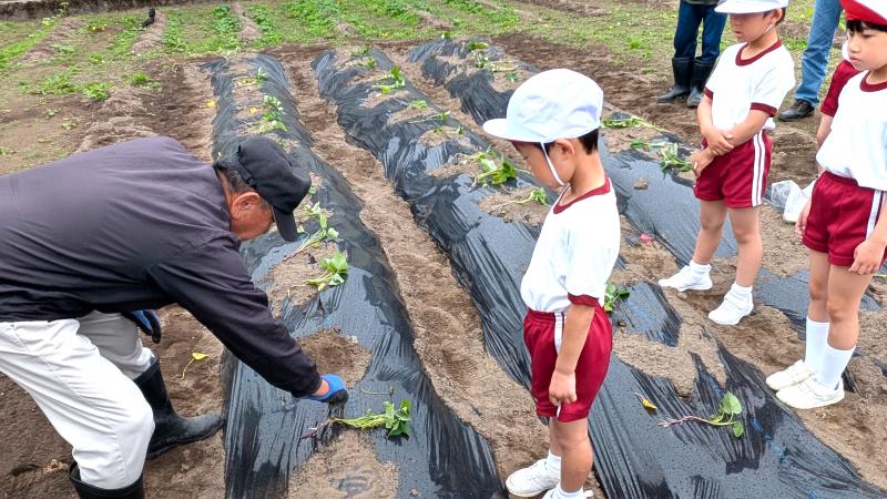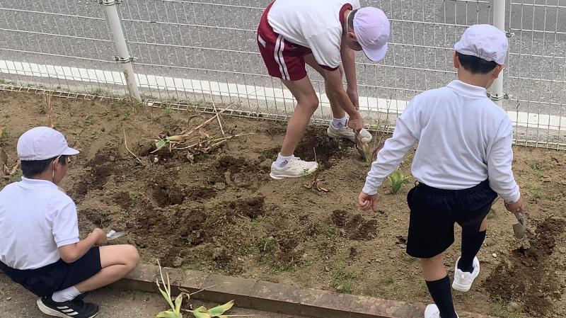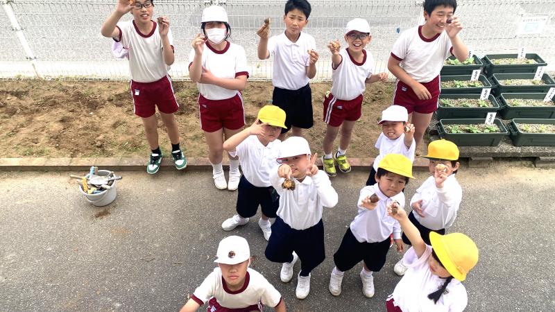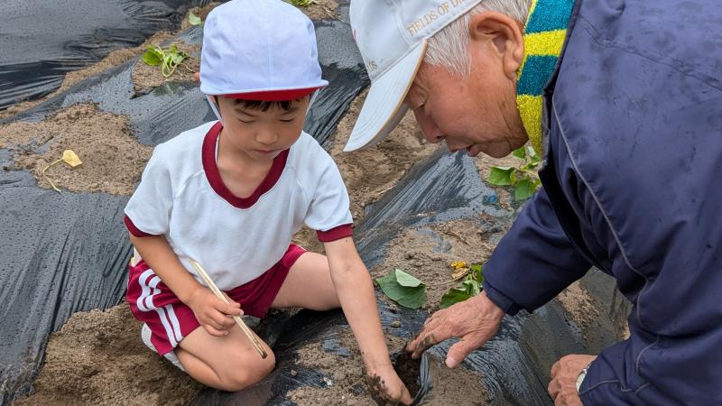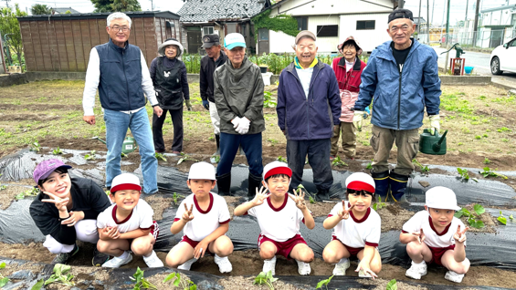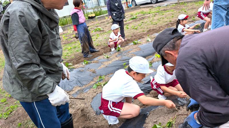 地域の方のご協力で、1年生が、サツマイモの苗植え体験を行いました。土を耕していただいたり、ビニールをかけていただいたりと、何から何まで準備していただきました。植え方も丁寧に教えていただき、1年生はとても嬉しそうでした。今から収穫が楽しみです。お世話いただいた皆様方、本当にありがとうございました。