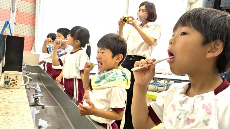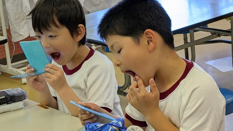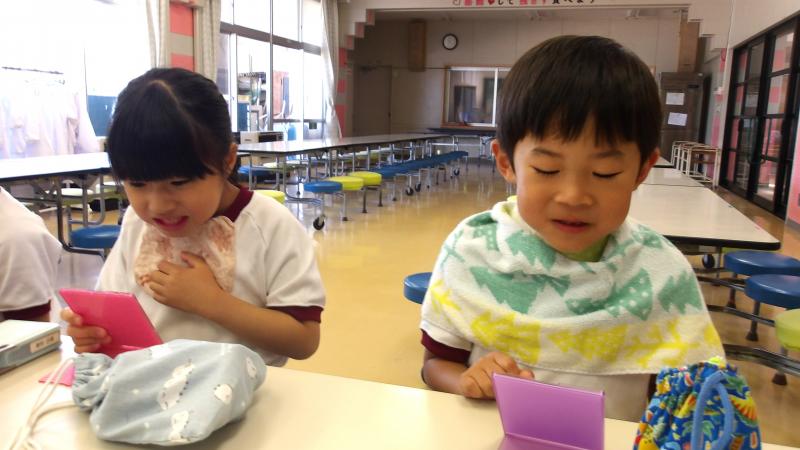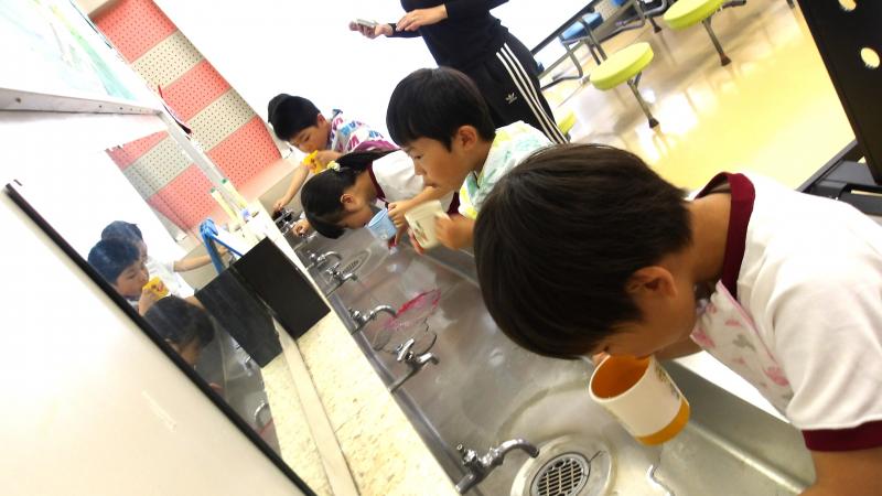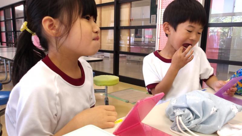 歯の磨き方教室を各学年毎に行っています。1年生は本日でした。歯のこと、よい磨き方等について説明を聞いた後、染め出し液を使用し、歯についたプラークを赤く染めだしました。これで、磨き残しの場所がはっきりわかります。しっかり磨いて、これからも、歯を大事にしてほしいと思います。
