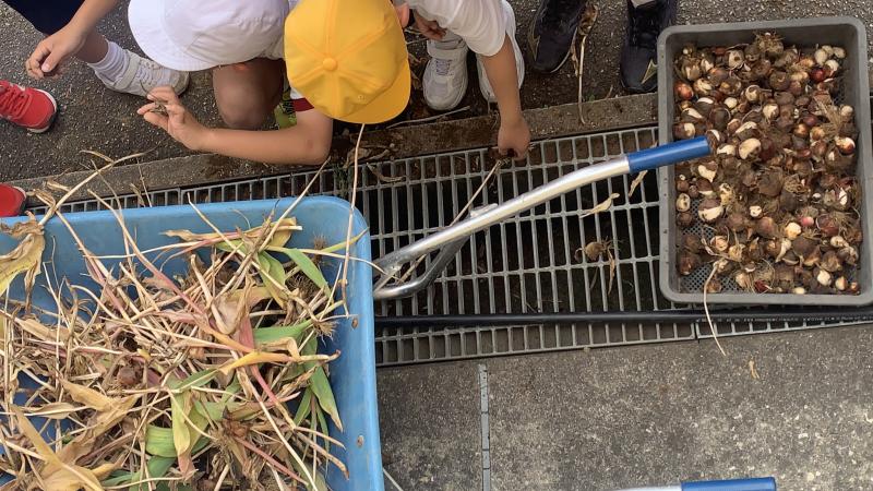 ながらく児童、職員、来校者の方々の目を楽しませてくれたチューリップですが、本日、球根を掘りました。児童達の手により、どんどん球根が掘り出されました。来年、またみんなの目を楽しませてくれることと思います。