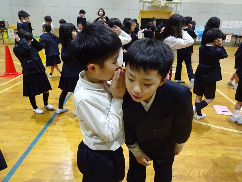 放送委員会が考えた伝言ゲームを全校でやってみました。最初に見たお題の言葉から同じ班のみんなに伝言していくと、不思議なことに言葉が変わっていってしまいました。「私はメリーさんですわよ」が「私は耳おんな」に変化するなど聞いていてとても面白かったです。全校が大笑いの伝言ゲームになりました。