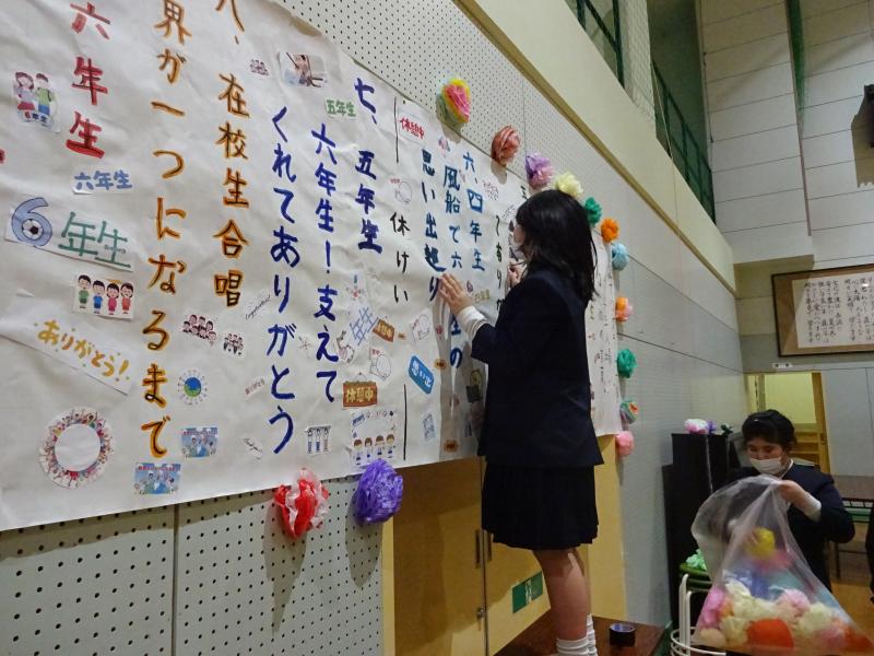 4・5年生が6年生を送る会の会場準備をしました。体育館全体にプログラムや、虹、似顔絵などを飾り、とても賑やかになりました。いよいよ明日は6年生を送る会本番です!笑いあり、感動ありの素敵な時間を過ごせるといいですね。
