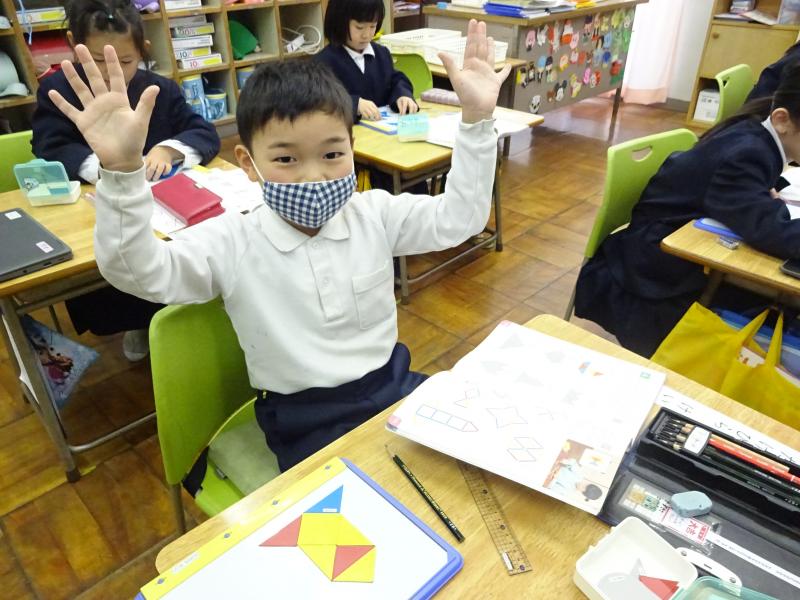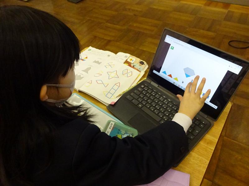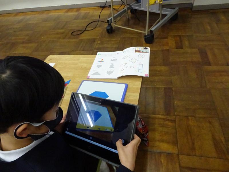 色板を使って様々な形を作りました。教科書に載っている形のシルエットと同じになるように色板を並べます。クロームブックを使うと、シルエットの上に色板を重ねることができるので、良いヒントになっていました。
