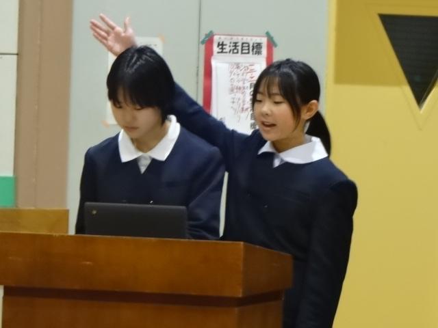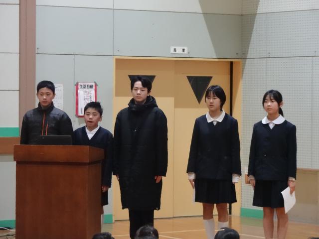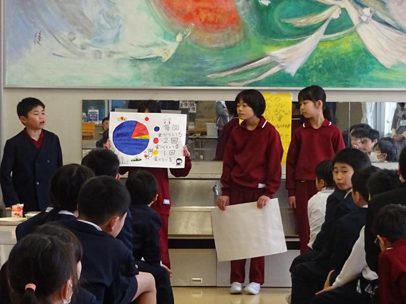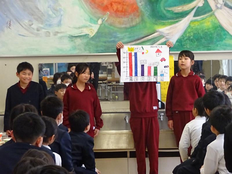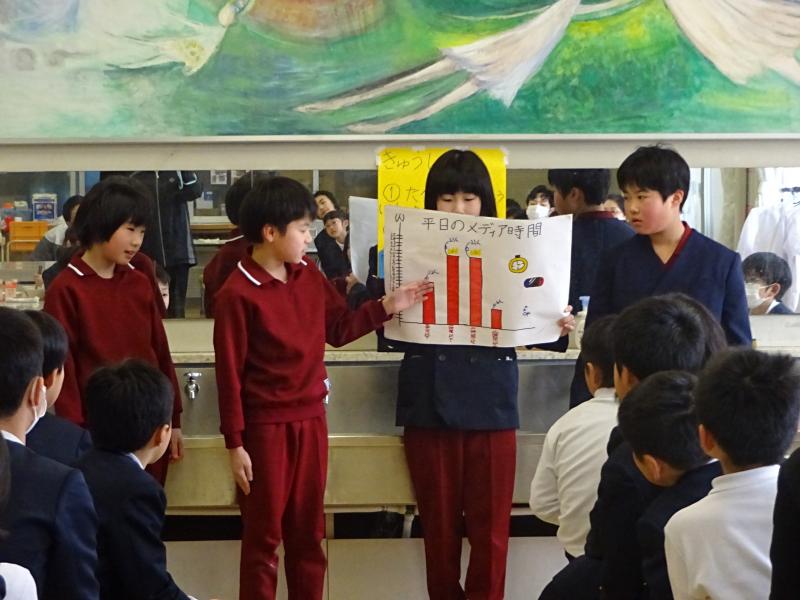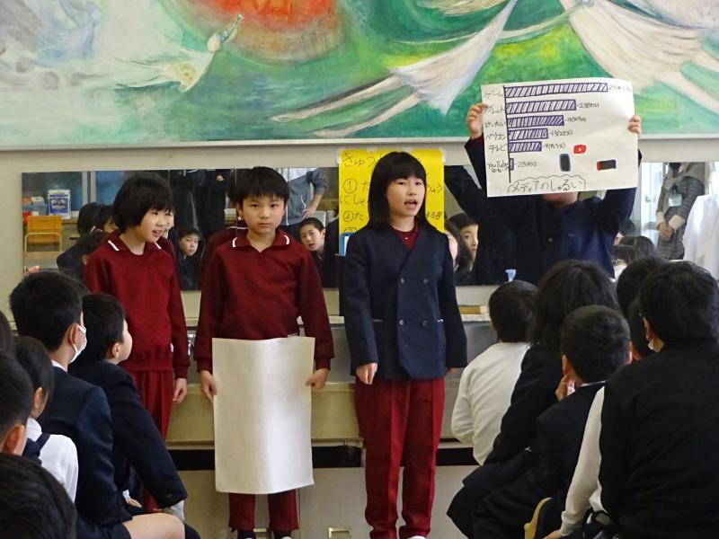 4年生が全校にアンケートを取り、グラフにして分かったことを発表しました。メディアの使用時間や何に時間をよく使っているのか、休日の過ごし方などがよく分かるようになっていました。もうすぐ春休みです。今日の発表を聞いて自分の生活をもう一度見直してみるといいですね。