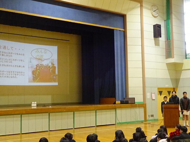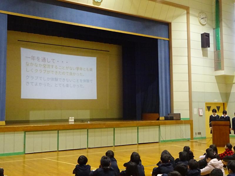 「スポーツクラブ」と「ものづくりクラブ」が1年間の活動を発表しました。とても楽しそうな活動の様子を見ていた1~3年生は自分たちも早くクラブに入りたい!という気持ちでいっぱいでした。来年度はどんなクラブができるのか楽しみですね。