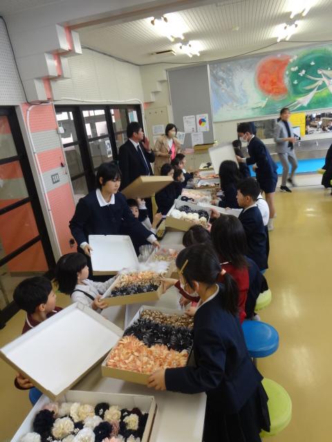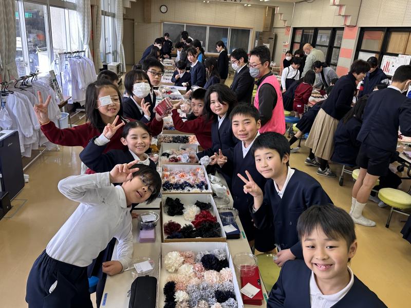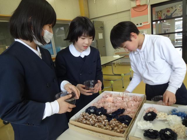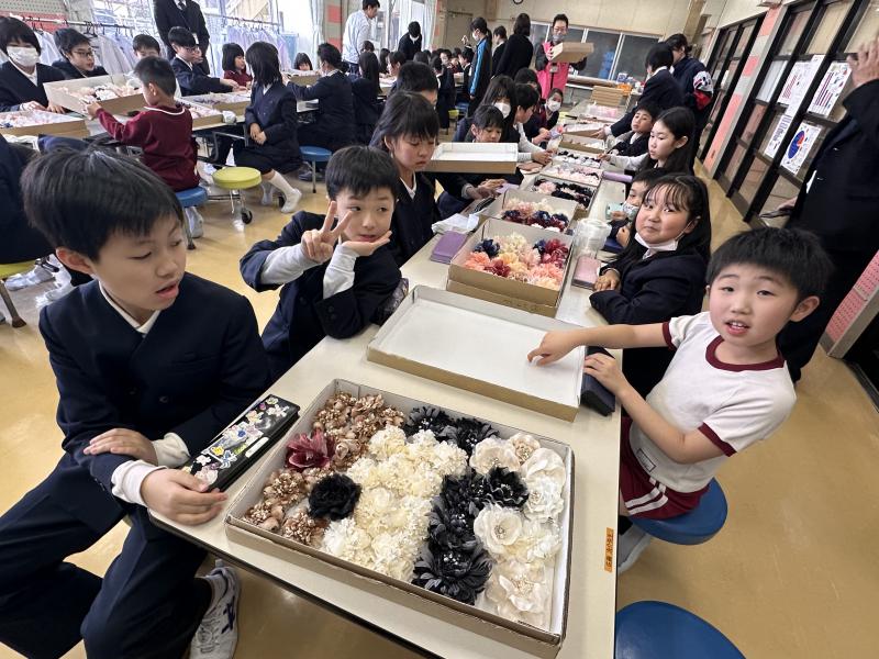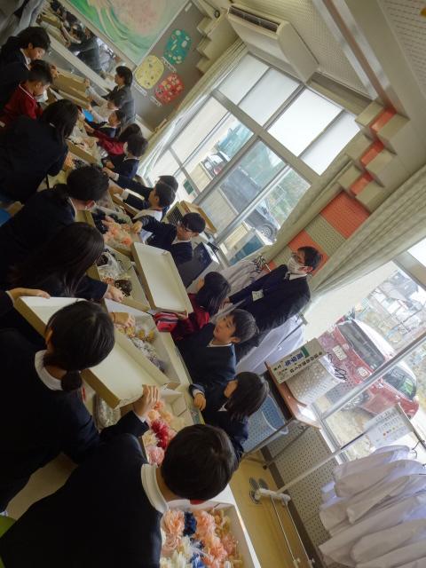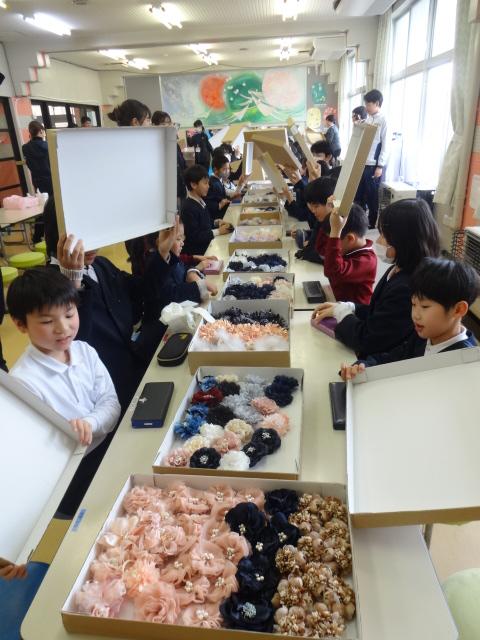 支援団体様より素敵なコサージュをいただきました、ありがとうございます。色とりどりのコサージュが箱の中から出てきたとき子どもたちは大喜びでした。子どもたちは普段お世話になっている人のことを思い浮かべながらどのコサージュにしようか考え、メッセージをカードに書きました。コサージュとともにみんなの笑顔が満開になり、素敵な時間になりました。