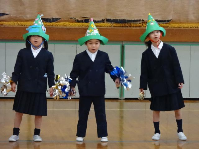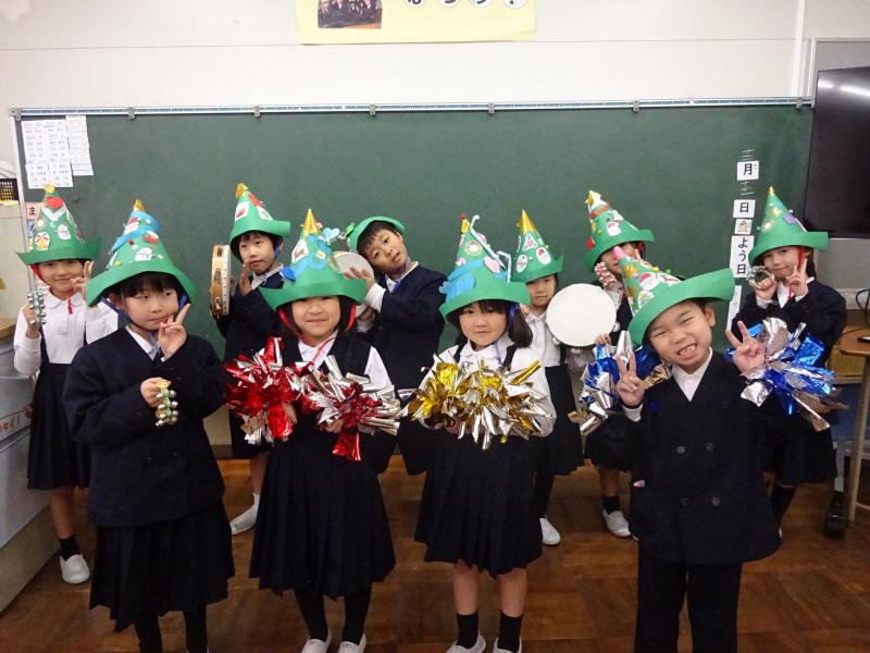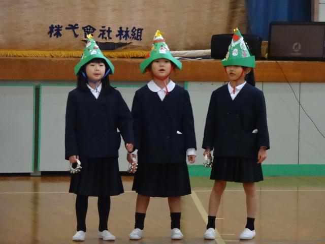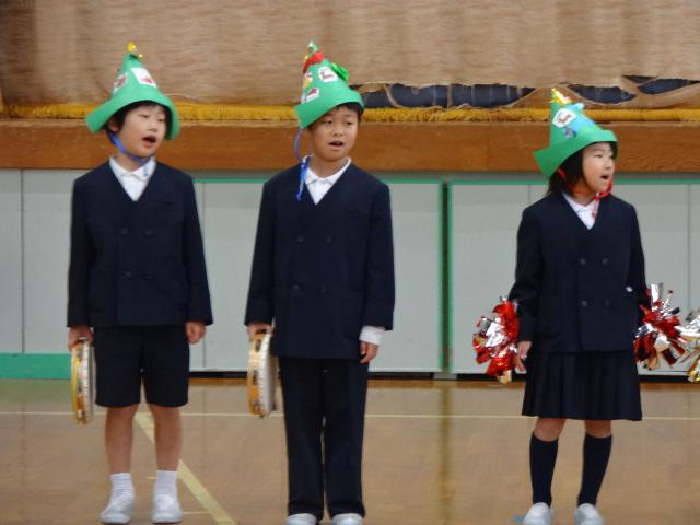本日、1年生の歌発表が行われました。オープニングには4年生のリコーダーの演奏の「オーラリー」です。その後、クリスマスツリーの帽子をかぶった1年生たちが「あわてんぼうのサンタクロース」を歌いました。もうすぐクリスマスです。そんなわくわくした気持ちを歌声に乗せながらかわいらしく発表できました。