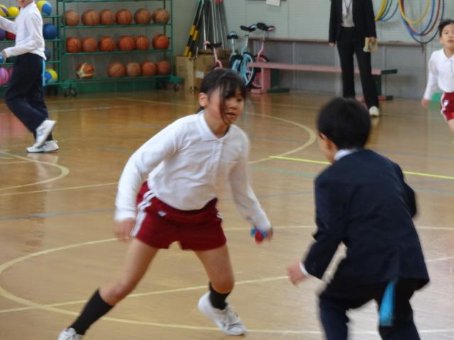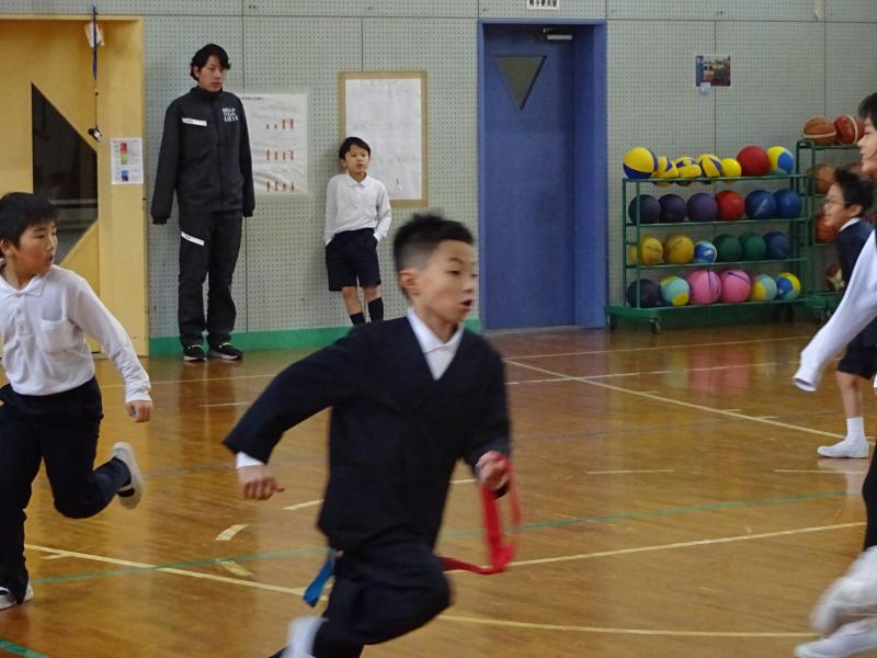 また、昼休みは保健委員会によるしっぽ取りが行われました。3班に分かれ、最後まで残った人の数を競い合いました。寒い中ですが、思い切り体を動かすのですぐに体が温まりました。これからも仲良く体を動かしていきたいですね。