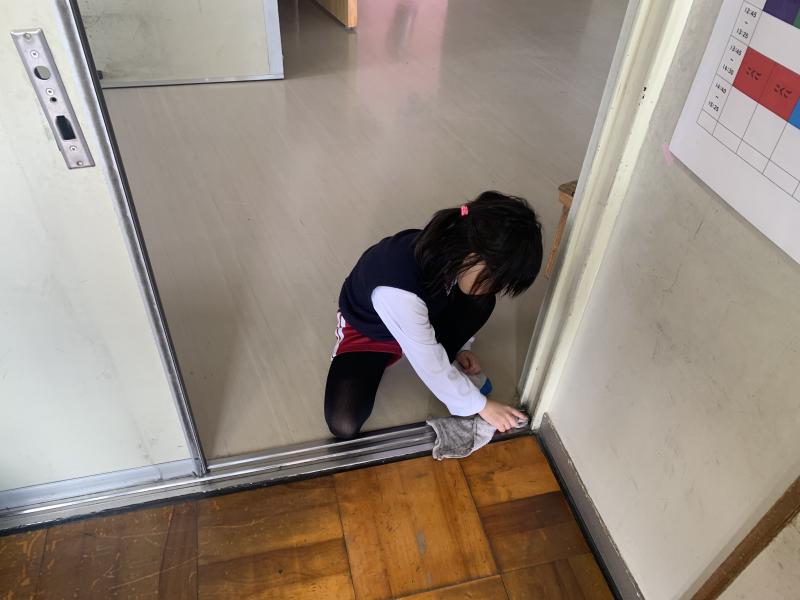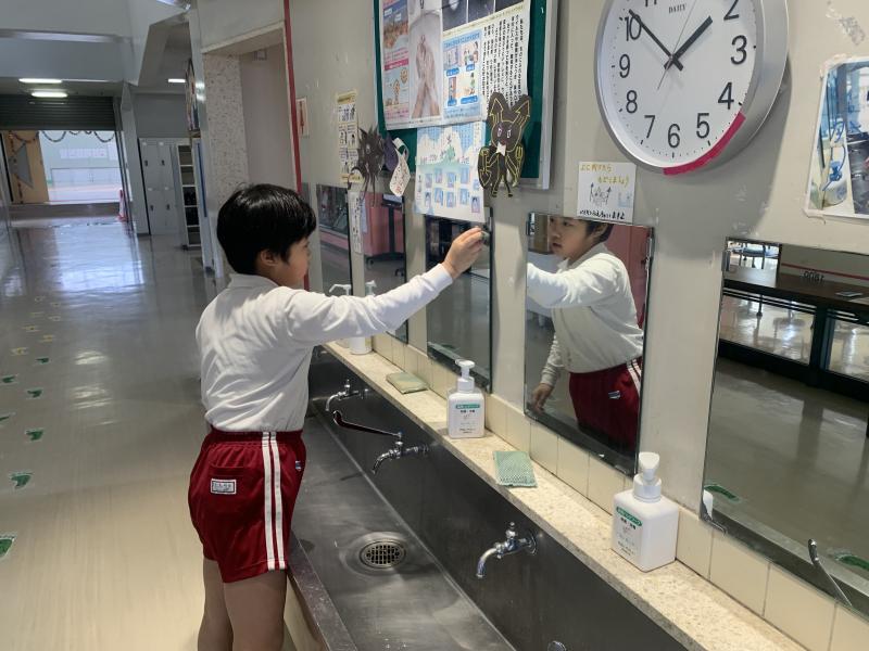 本校1階の廊下には、今メッセージ(「お手本だ」「よく出来ました」等)入りの足形が点々と貼られています。その足形に合わせて足をのせると歩くことになるよう貼ってあります。廊下を走らないようにという注意喚起です(運営委員会が考えてくれました)。逆に、体育館では、思い切り動いてもらうよう、様々なおにごっこが行われています。写真は「3色オニ」。例えば赤が青を、青が黄色を、黄色が赤を追いかけるというルールで、皆ずっと動き続けます。大変楽しそうです。
