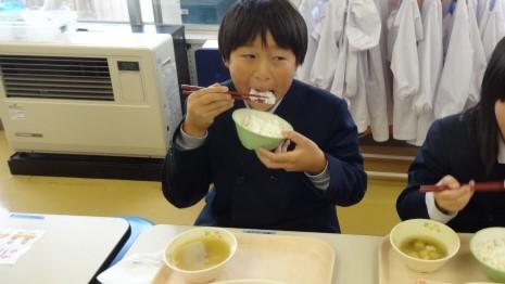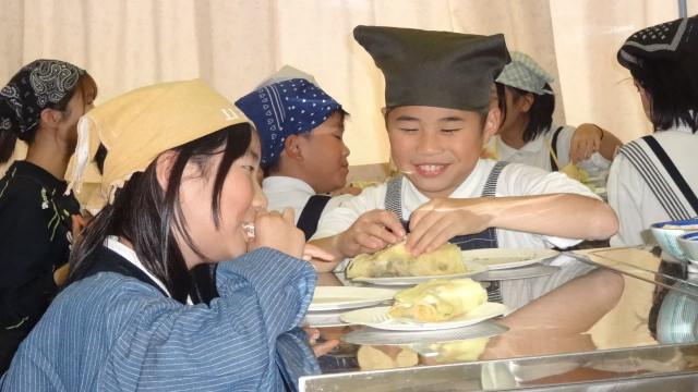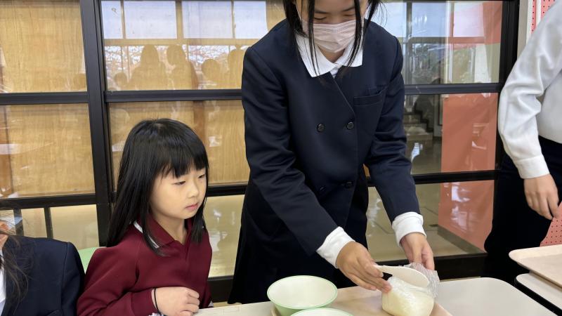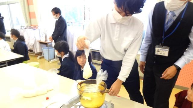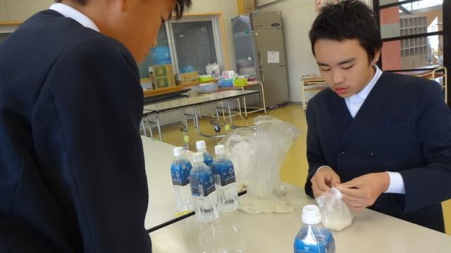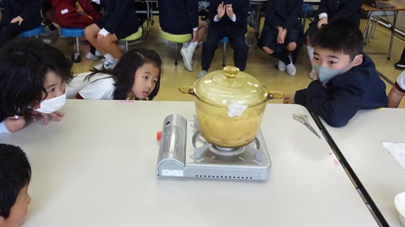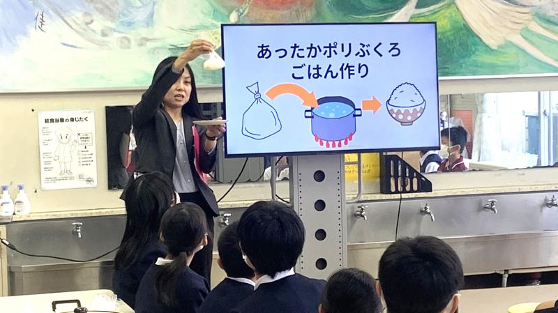 有事の際に、こんな方法でもご飯が出来るということも学んでほしくて、ポリ袋を使ったご飯づくりに取り組みました。ラップに入ったお米(浸水させておいて)と水を茹でるだけで、ちゃんとご飯が出来ました。子供達は、少し不思議そうでしたが、食べてみて、とても納得顔でした。