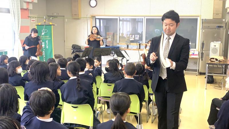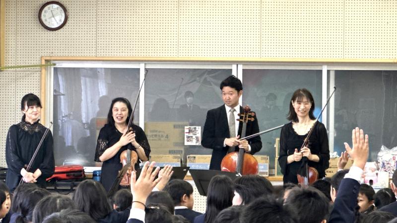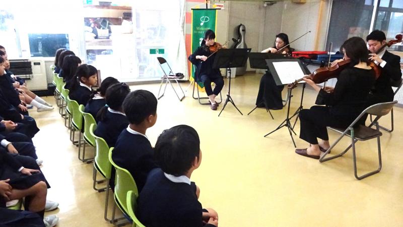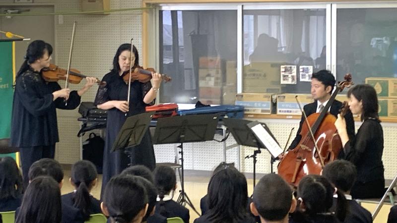 中部フィルハーモニーオーケストラから4名の弦楽四重奏の方が来て下さり、素晴らしい演奏を聴かせてくれました。子供達が知っている曲も多く、自然に子供達は体を動かし、声を出し、思い切り演奏を楽しみました。本当にありがとうございました。