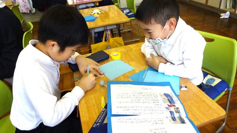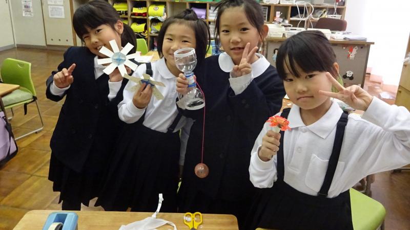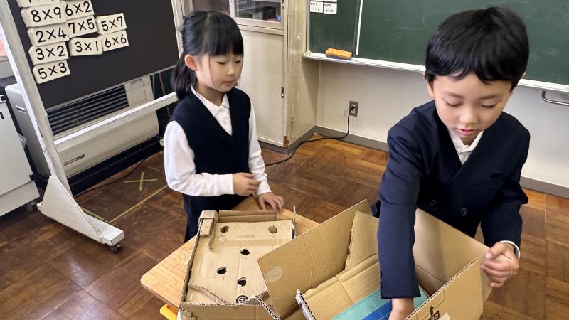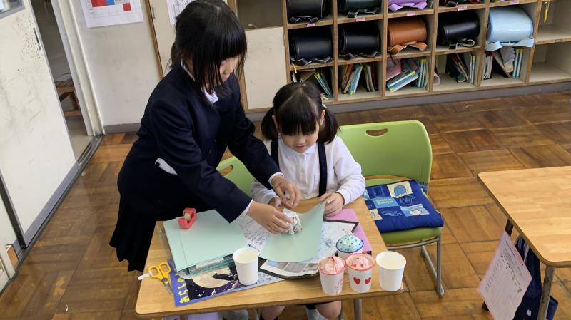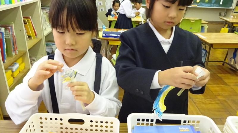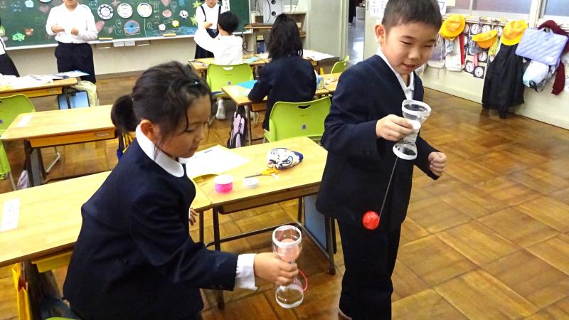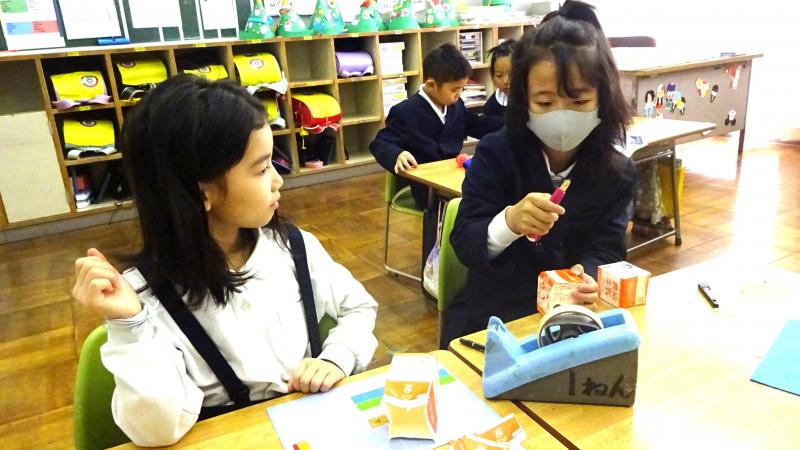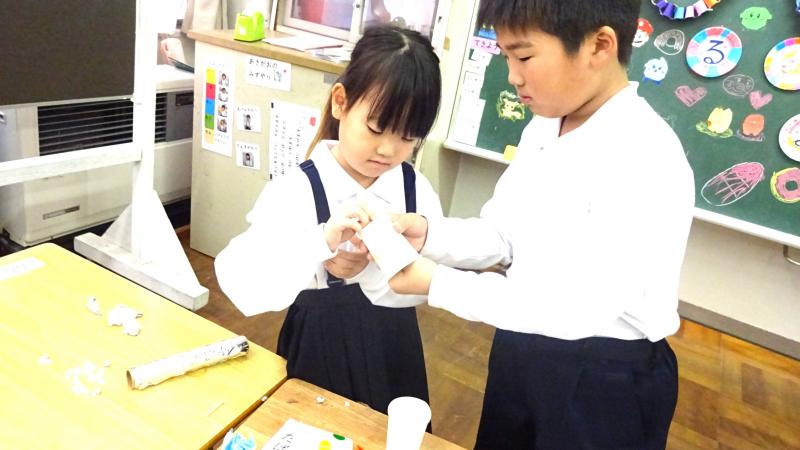 2年生が国語で、説明文を勉強しています。その学習の一環として、おもちゃの作り方を説明文として書き、それにもとづいて1年生に実際におもちゃの作り方を教え、一緒に通るという学習を行いました。2年生がやさしく1年生に、おもちゃの作り方を手ほどきし、一緒になって遊ぶ姿は大変ほほえましいものでした。こうして子供達は成長していくのですね。