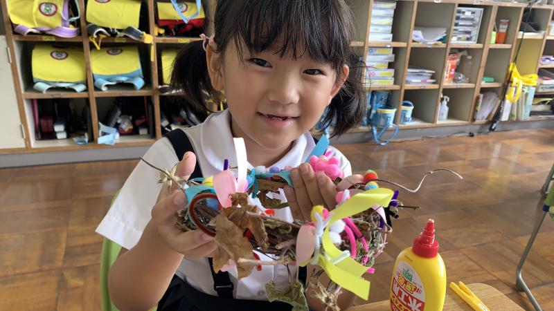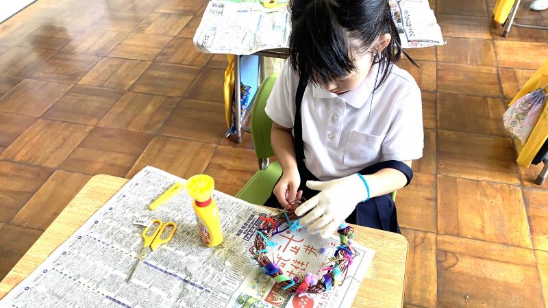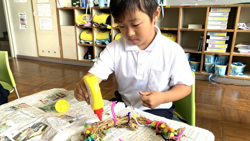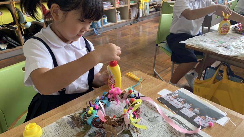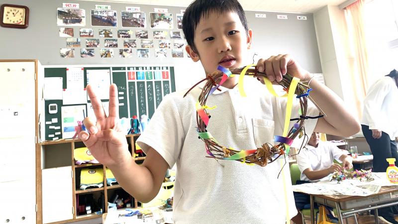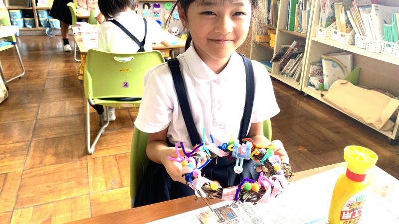 1年生が、朝顔の弦でいよいよリースづくりを行いました。接着剤を使うのに緊張しながら、色んな材料も加えて、カラフルで楽しい素敵なリースが出来ました。皆、出来栄えに、とても満足そうでした。