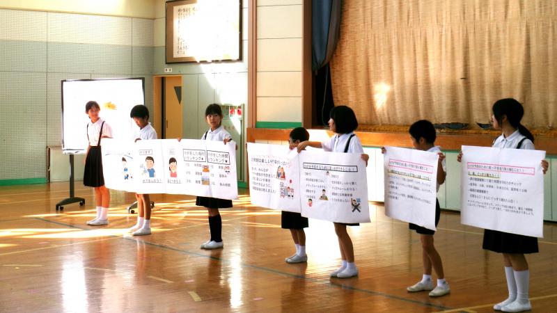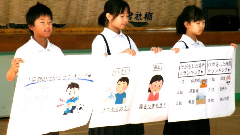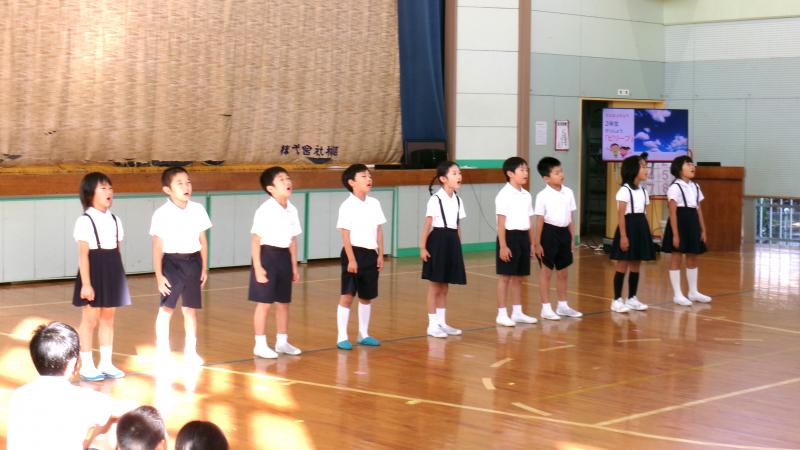 本日児童集会がありました。今日は2年生が歌の発表をしてくれました。仮設住宅に入居されている方も見にきて下さって、子供達は張り切って歌っていました。発表の前に、1年生が「白くまのジェンカ」を踊ってくれて、発表会を盛り上げてくれました。今日から新しい先生も来られ、その紹介も出来ました。昨年度まで本校におられた先生で、子供達は懐かしく、嬉しそうでした。また、保健委員会の発表もありました。「校内で起きるケガのこと」「「清潔チェックをがんばろう」のこと等、しっかり準備をして素晴らしい発表でした。盛沢山の児童集会でしたが、皆輝いていました。