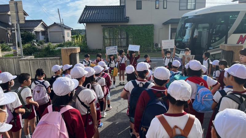 本日(9/27(金))は、子供達がとても楽しみしていた全校バス遠足です。今朝ほど、無事2台の大型バスで出発しました。行先はかほく市の「あそびの森かほっくる」と、羽咋市の「コスモアイル羽咋」です。出発に先立ち、今回の遠足リーダー4年生が、改めて班毎の目標を紹介してくれました。いいお天気にも恵まれて、絶好の遠足日和!いっぱいいっぱい楽しんでほしいと思います!