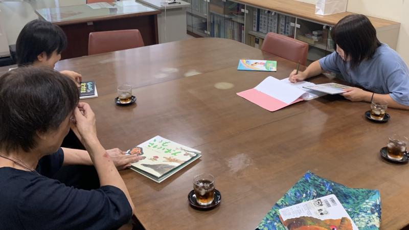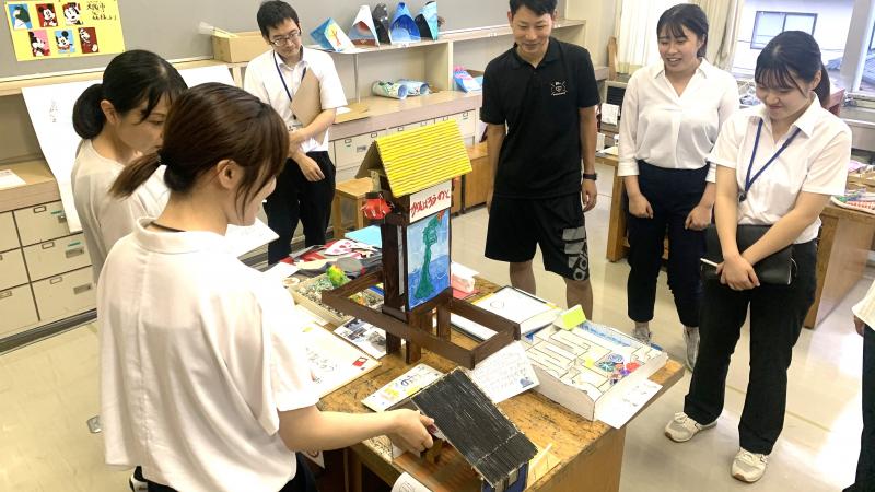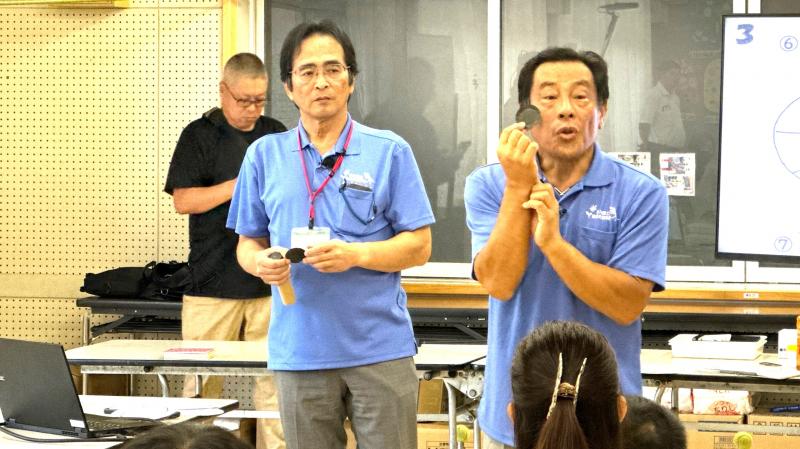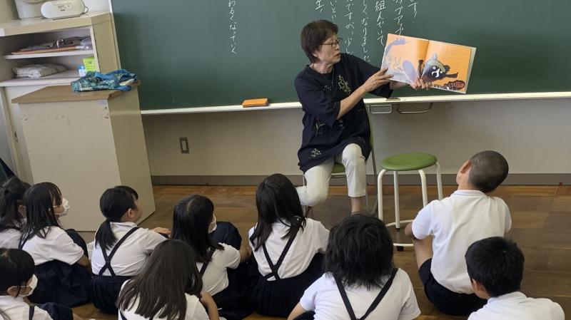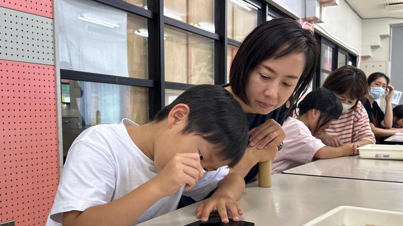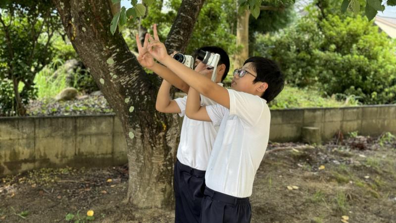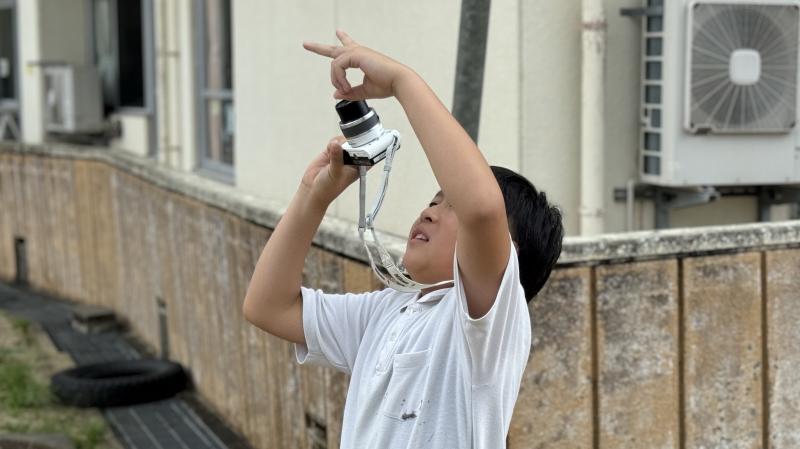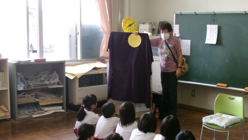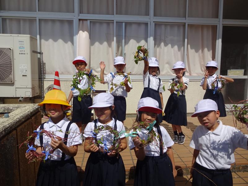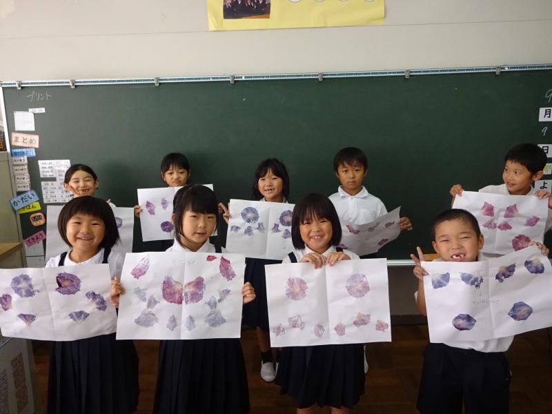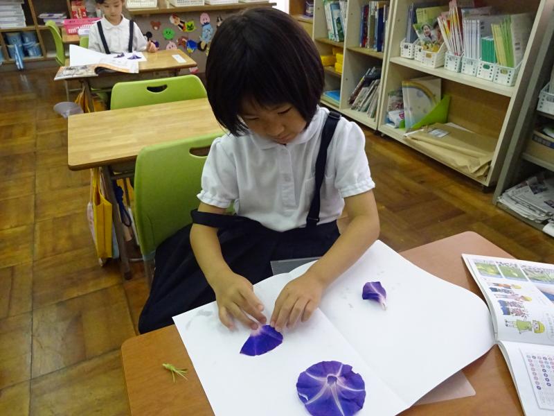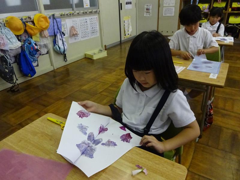 1年生は生活の時間に朝顔を使ってたたき染めやリース作りを行いました。紙の上に朝顔を花を並べて挟み、強くこすります。しっかりと力を入れてこすらないと中々色が出てきません。できた模様を見てみると、顔のように見えたりチョウのように見えたりと様々で面白いです。