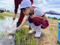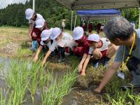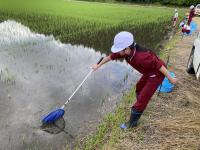 子どもたちは、田植えの田んぼと直播の田んぼの2か所で、生きものを見つけました。採集した生き物を分類した後は、田んぼによって見つけられた生き物の種類や数が異なったことに対して、なんでだろうと疑問を抱いていました。