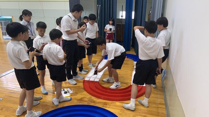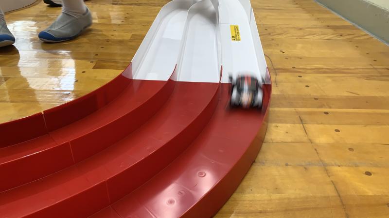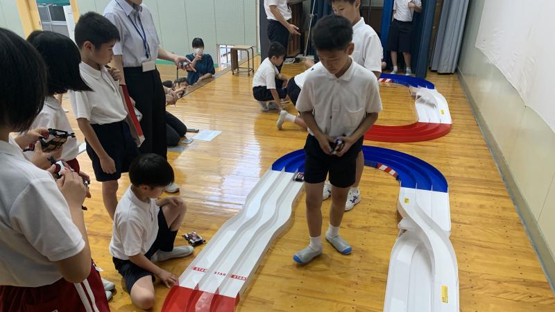 支援でいただいたミニ四駆で楽しみました。サーキット場も2ついただけたので、設置し、希望者を募ってタイムを競いました。同じようなミニ四駆ですが、タイムは異なります。子供達はとても熱中していました!