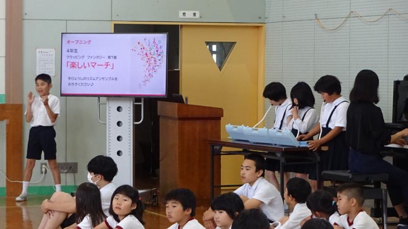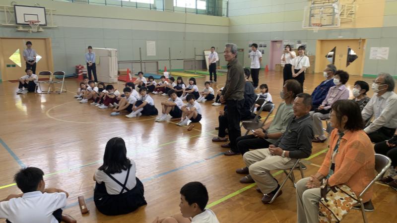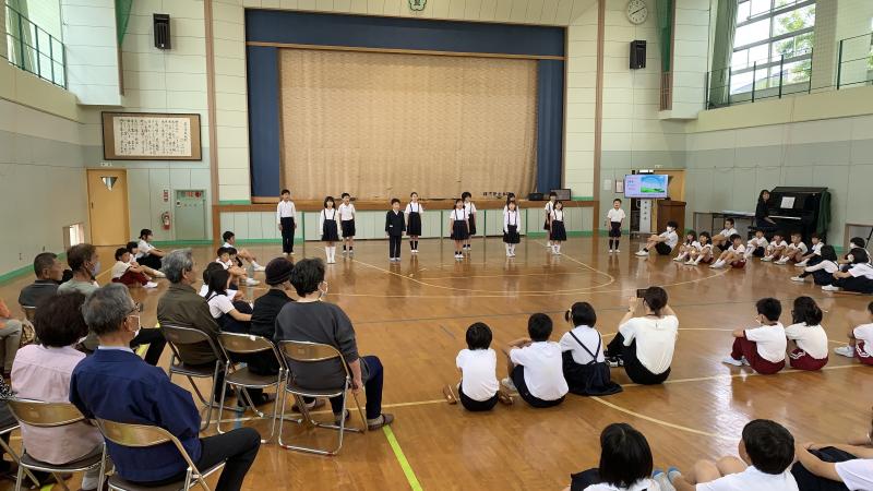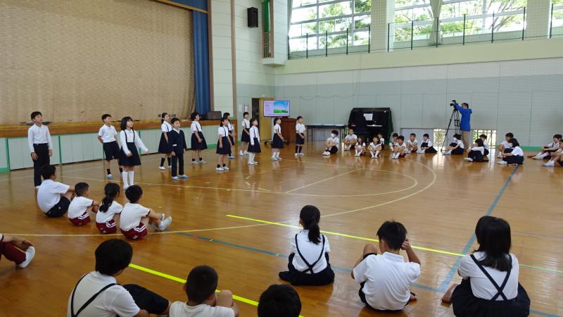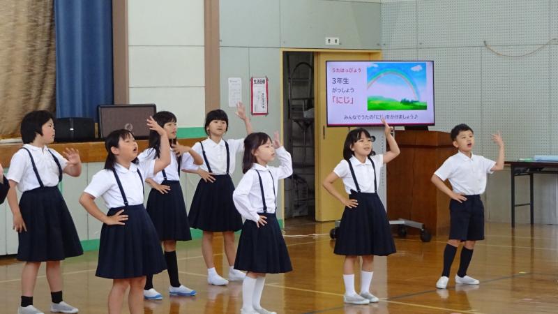2024年6月11日 18時58分児童集会で、3年生が歌の発表をしました。「にじ」という曲を、振り付け付きで披露してくれました。発表前のオープニングで4年生が振り付きで歌ってくれたり、5年生がリコーダーで伴奏を応援してくれたりと、他学年の協力もあり、歌も振り付けも、とても素敵でした。発表の後、全校で振り付きで歌いました。仮設住宅の方々も観にきて下さり、とても楽しい時間を過ごすことが出来ました。