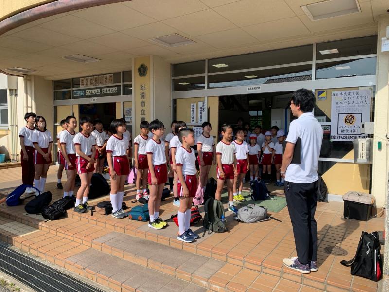 2024年6月12日 11時27分本日より、5、6年生は羽咋市の国立能登青少年交流の家で1泊2日の宿泊体験学習に出発です。全校児童に見送られて出発です!